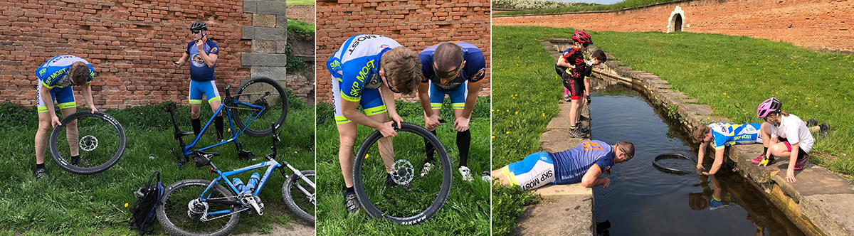 Ještě že tam byl :) Vím, že už to není moc vtipné, ale Davidovi to nedalo a nastavil svoji křehkou duši neoblomnému trnu. Tak tu máme další neplánovanou zastávku - defekt č. 2. Alespoň můžeme nasát tu zvláštní atmosféru v srdci této magické pevnosti. Vedro nás doprovází celou cestu a tak nebylo od věci zahodit boty i ponožky a osvěžit se ve vodě. Á, tak to bude asi na dlouho, protože stávkuje už i pumpička. Ženy, děti a starci vyráží napřed směr Litoměřice.