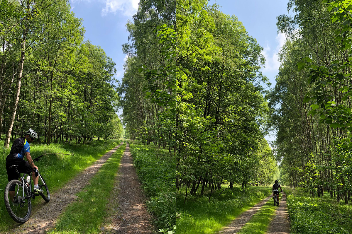 Najíždíme na silnici a po pár metrech se dáme prudce vlevo na značenou cyklotrasu č. 231. Protože je potřeba vše zdokumentovat, vyfotil jsem vjezd do lesa, aby ho třeba někdo z vás při nějaké vyjížďce neminul.