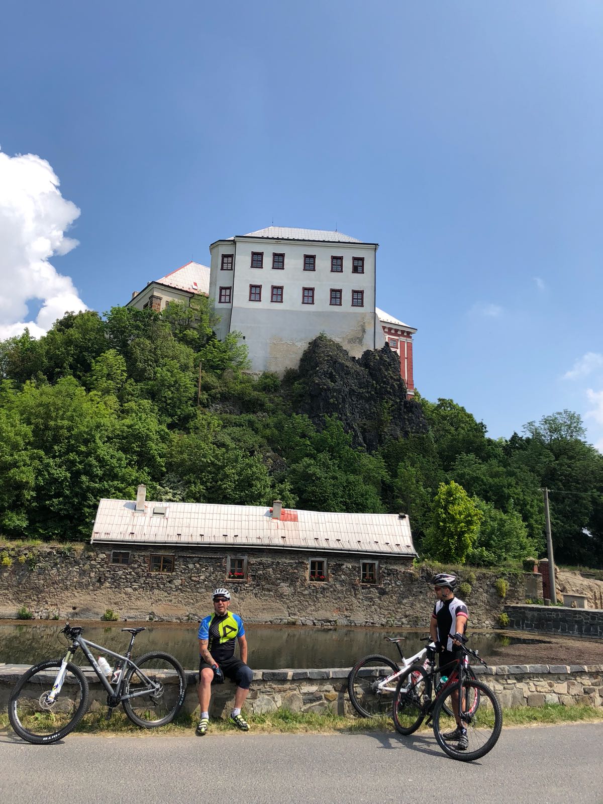 Cestou od rybníku jsme projížděli kolem pozůstatků nějaké stavby, že by také vojenské? No snad k tomu někde na netu něco najdu. Od rybníku jedeme dolů po asfaltové cestě až na hlavní silnici Milešov - Kostomlaty, tam odbočíme vpravo na Milešov. Užíváme si rychlou jízdu z kopce, protože nemusíme šlapat a máme to bez námahy. Kocháme se pohledem na nejvyšší horu Českého středohoří Milešovku, kterou máme celou dobu po levé ruce. Přijíždíme do Milešova a zastavujeme pod zámkem u rybníčku, abychom se poradili, kam dál.