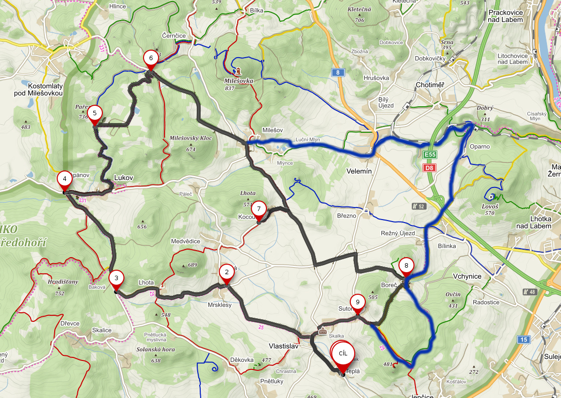 Na závěr ještě mapka, kdybyste chtěli někdy vyrazit bez nás, tak ať se neztratíte. Rozdíl oproti našemu výletu jen ten, že v Milešově se odbočí na Kocourov. My jsme si to prodloužili zhruba o 10km přes Opárenské údolí. (viz modrá trasa)